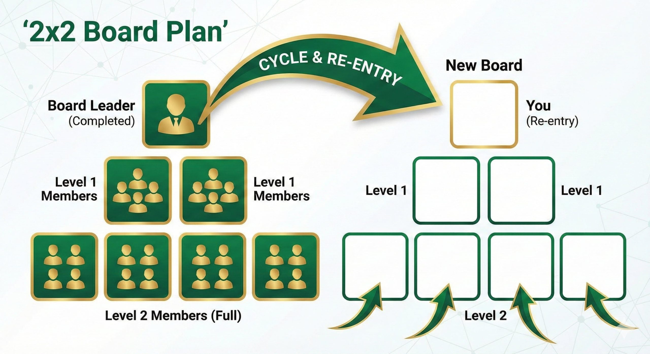 A board plan, also known as a revolving matrix plan, is a compensation structure where distributors are placed into fixed-size boards (typically 2×2 or 3×3 matrices) that fill through new recruitment or spillover. Once a board is completed, it “cycles,” triggering payouts and often re-entry into a new board.