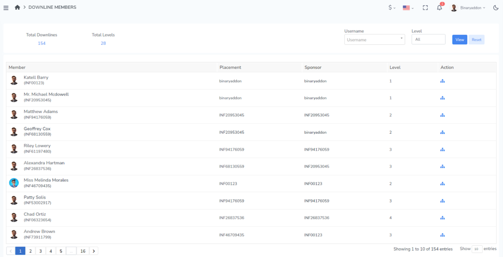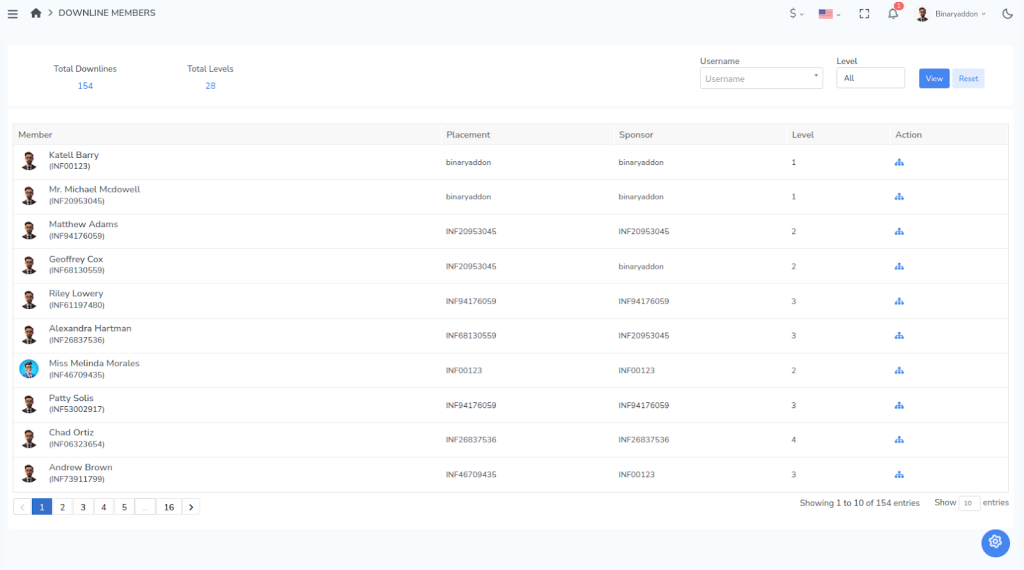 A complete list of all members in your downline network will be displayed.