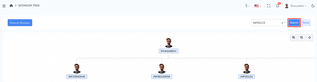 This feature helps you quickly identify relationships, track referral structures, and analyze network growth without manually browsing through each level of the tree.