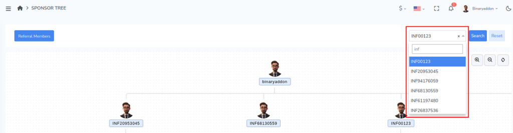 This feature helps you quickly identify relationships, track referral structures, and analyze network growth without manually browsing through each level of the tree.