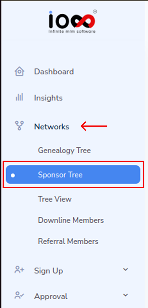 Step 1: From the left-side menu, go to Networks and select Sponsor Tree. This opens the graphical view of your referral hierarchy.