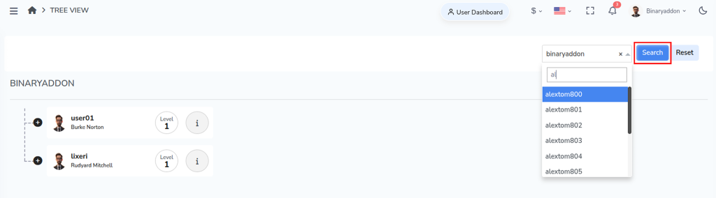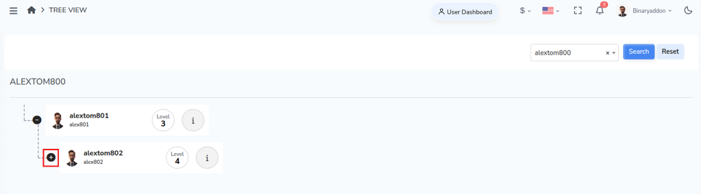 Step 2: Enter a Username and click Search. The system displays all downline levels under the selected user in a tree structure.