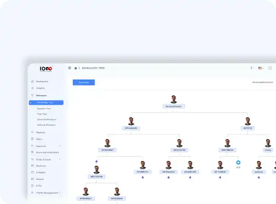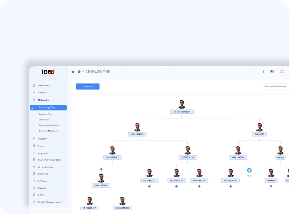 Access advanced features Manage the entire network through an interactive genealogy tree view. Add, organize, and monitor distributors across levels using a single unified interface.